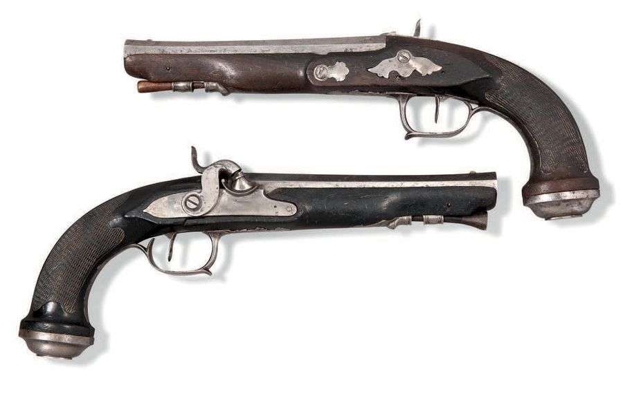 Pistolets fabriqués à silex à la fin du XVIIIe siècle, et convertis à percussion au XIXe siècle.