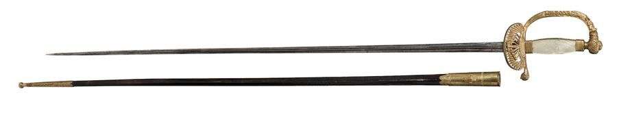 Monture en bronze doré, garde à une branche principale à décor de trèfle flanqué de feuilles d'acanthe. Plaquettes en nacre, clavier ajouré au modèle de l'Institut d'Egypte. Fourreau en cuir à deux garnitures de laiton. Chape à bouton en forme d'écus.