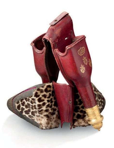 Couvre-fontes en marocain rouge, couverte de peau de léopard garnie de deux galons en argent.