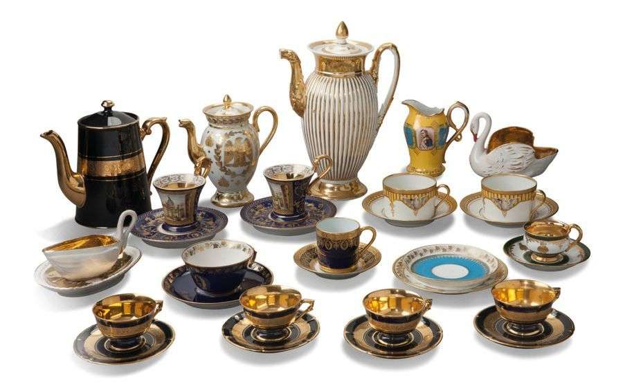 Réunion de 11 petites tasses et sous-tasses, 1 pot à lait et 3 cafetières, dont une avec sa soucoupe, ainsi qu'une pièce en forme de cygne, dont une avec sa soucoupe. Formats et décors divers. Certaines tasses et sous tasses ornées de motifs d'abeilles en or et de frises de lierre dorée. Pot à lait orné d'un portrait peint de l'Empereur. 1 cafetière décorée de l'Aigle Impériale. Marques apocryphes sur plusieurs pièces.