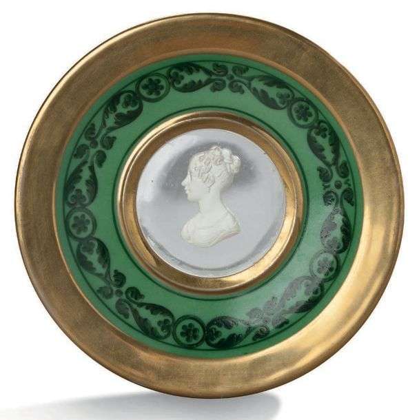 Décor de frises de feuillages peintes en verre sombre sur vert pâle| portraits en buste de profil, à l'imitation des camées antiques, cerclés d'un bandeau doré à l'or bruni| filets, aile et anse élevée également dorés. Marque en creux, sous le profil de la duchesse: «Desprez». D. et H. tasse (avec anse): 10 et 6 cm. D. sous-tasse: 14 cm.