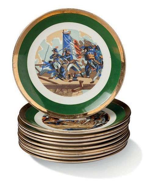Bassins à décors polychromes représentant des épisodes célèbres de l'épopée napoléonienne. Aile verte bordée d'une frise d'abeilles dorée.