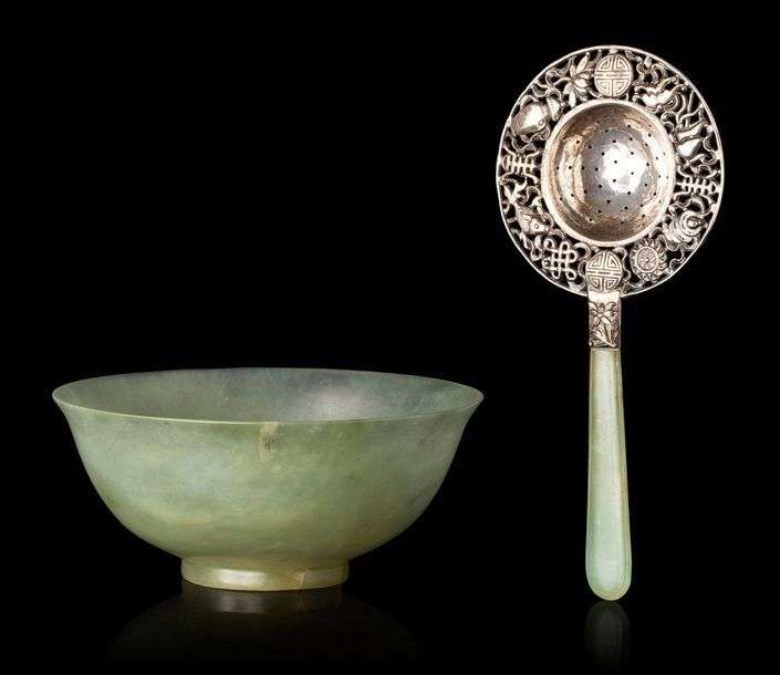 Bol en jade et cuillère à thé avec manche en jade et filtre de forme circulaire en argent à décor de deux motifs shou "longévité" et des huit emblèmes bouddhiques.