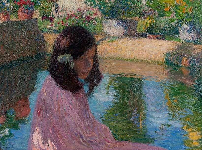 La chaleur brulante du soleil du midi évoquée dans sa Vue de Labastide-du-Vert a disparu au profit de la fraicheur procurée par l'un des deux bassins de la propriété, et par l'ombrage des feuillages qui rendent moins perceptibles les traits de l'enfant que l'on devine assise sur la margelle.