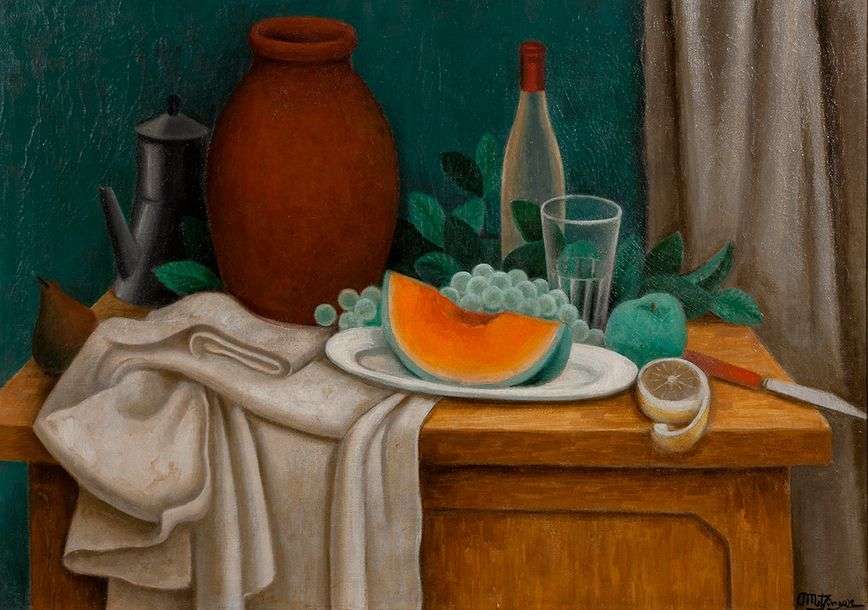 The painting presented here perfectly synthesises Metzinger's attachment to traditional painting and the Cubist precepts he had upheld and then abandoned in 1921 for what he called «constructive realism». Here the important aspect is the volumes and the interactions of the objects in both chromatic and linear terms. Metzinger only returned to Cubism after the Second World War.