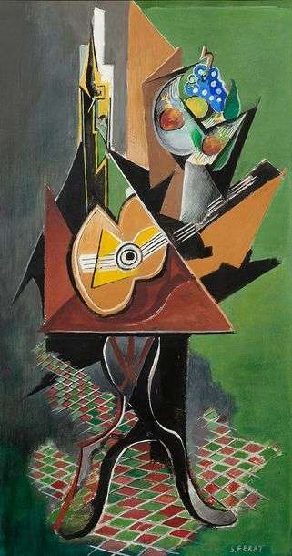 Here Férat achieves a masterly sense of progression in the composition from the severe diamond grid pattern at the bottom of the painting to the supple, rounded forms of the fruits seemingly poised in equilibrium at the top. While the picture meets the criteria of a mature Cubism, the artist's palette is more varied and colourful.