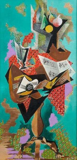 Impossible de ne pas évoquer Arcimboldo devant cette toile : Férat, fait surgir de sa nature morte un étrange personnage, poète musicien vêtu de la nappe rouge vif qui tient lieu de cape de matador semble tenir en main partition et guitare.