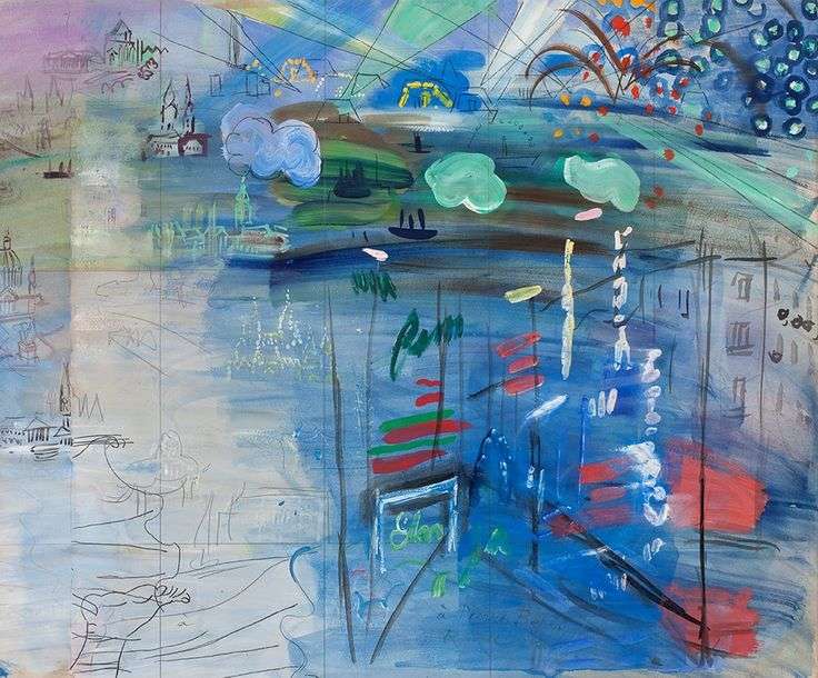 The Paris City Hall electricity company commissioned a monumental work from Dufy for the World Exhibition of Art and Technology in Modern Life held from 25 May to 25 November 1937 in Paris, and for the Universal Exhibition of 1937. The purpose of the work was to “highlight the role of electricity in national life, and in particular the primordial role played by electric lighting in society”, as specified by the commission. The huge majority of the time put into these monumental panels was spent on documenting the machines and producing studies, like the ones presented here.