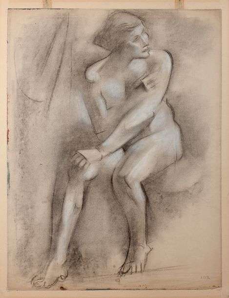 Dessin au fusain et rehauts de craie blanche sur papier, marqué du cachet de la signature en bas à droite