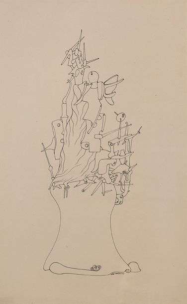 The drawing must have been produced in a single line, creating an inextricable construction of objects that are hard to make out, but seem to include measuring instruments and compasses around a kind of sheet, with a few folds giving harmony to the composition. This assemblage of nuts and points obliges the viewer to try to enter the artist's imagination to understand its meaning