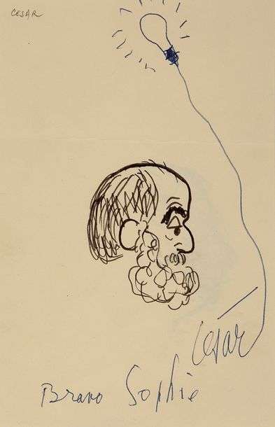 Stylo à bille et encre brune sur papier, dédicacé en bas et signé en bas.