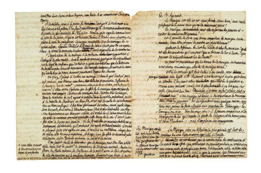 [Dans cette brochure anonyme, Le lecteur y mettra le titre («Londres 1777», 96 pages), Mirabeau défend en particulier la musique du violoniste, compositeur et chef d'orchestre napolitain Ignazio RAIMONDI (1735-1813), dont le nom est ici écrit en clair (il sera réduit à son initiale dans le pamphlet). Le manuscrit présente de rares ratures et corrections. Son texte correspond à celui du milieu de la p. 17 jusqu'à la première ligne de la p. 24 de l'imprimé, avec des variantes mineures, et des lignes non retenues dans la version éditée.]