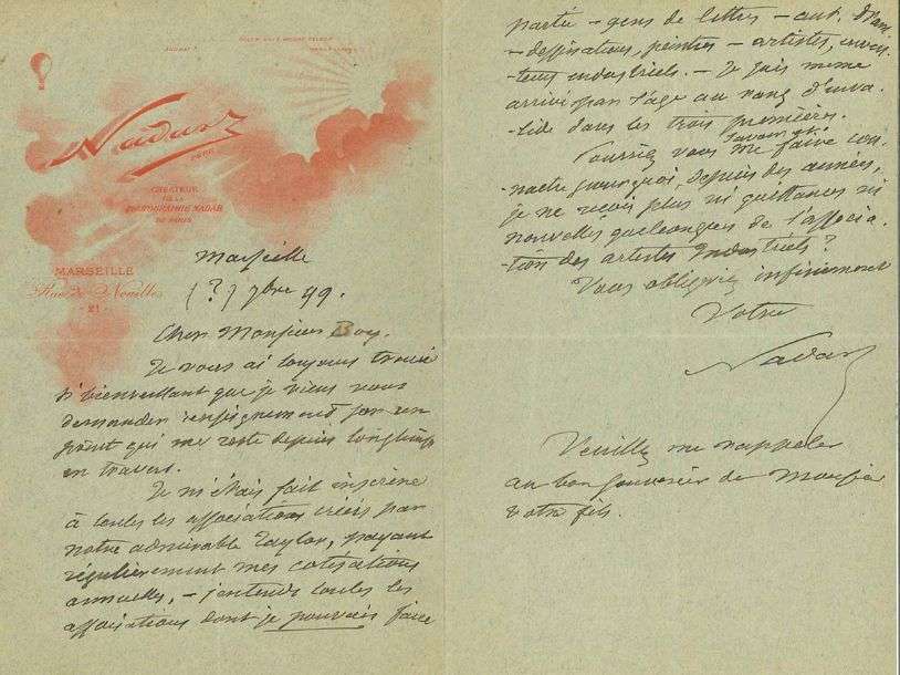 L.A.S. à M. Boy. Marseille, (?) [sic] septembre 1899. 2 pp. bi-feuillet in-8, en-tête en coin illustré de Nadar| cachet de collection.
