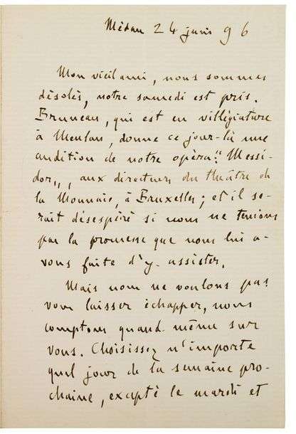 Son samedi est pris. (...) Bruneau, qui est en villégiature à Meudan, donne ce jour-là une audition de notre opéra: «Messidor» aux directeurs du théâtre de la Monnaie, à Bruxelles| et il serait désespéré si nous ne tenions pas la promesse que nous lui avons faite d'y assister (...). Il laisse son correspondant choisir n'importe quel jour de la semaine suivante, mardi et jeudi exceptés, pour une visite.