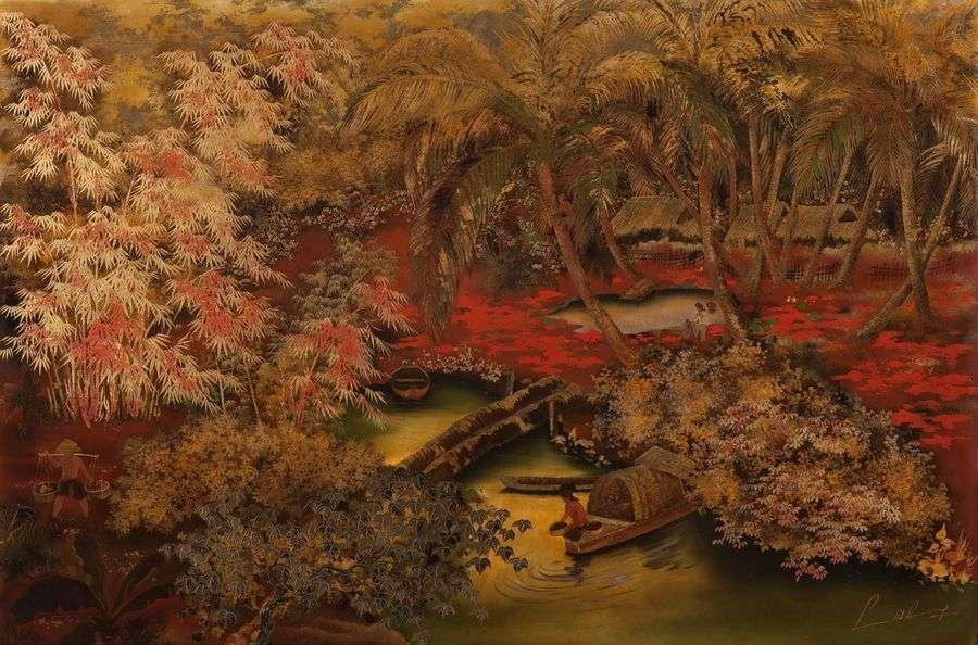 Panneau de laque et réhauts d'or, signé en bas à droite