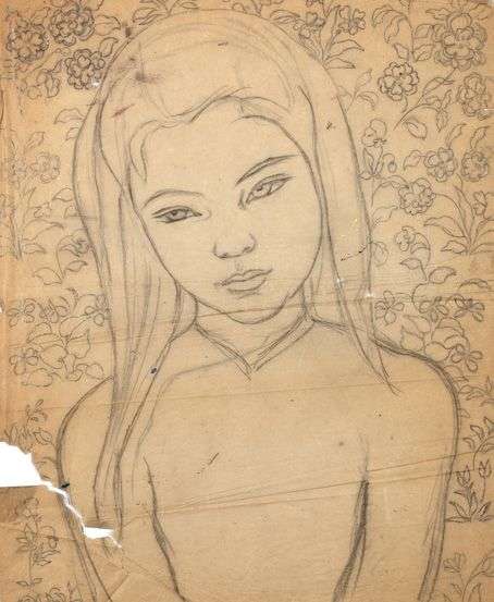 Portrait de jeune fille, fond fleuri