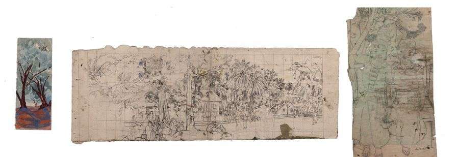 Une aquarelle et deux dessins à l'encre sur papier, l'une signée en bas à gauche