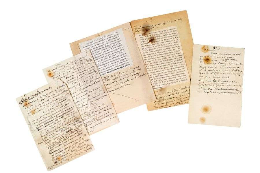 Manuscrit autographe d'Apollinaire comportant de très nombreuses ratures et corrections de sa main, 6 pages sur 5 feuillets. Ce manuscrit destiné à l'impression comporte contrecollés par Apollinaire deux extraits imprimés d'un texte rédigé par les amis de La Peau de l'ours.