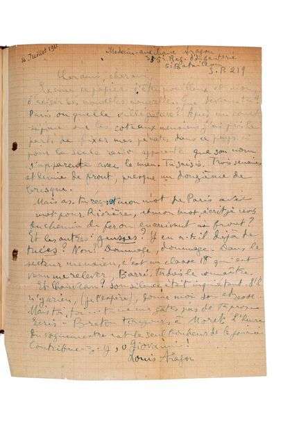 Aragon à Jean Vergnet, 16 juillet 1918, 1 page in-8 et 10 août 1918, 2 pages in-8. Elles sont adressées du front où Aragon était médecin auxiliaire. «[...] C'est un classe 18 qui est venu me relever. Barré tu dois le connaître. Et Chauveau? Son silence était inquiétant. S'il n'y a rien, donne moi son adresse. Mais toi, toi, tu ne me gâtes pas de ta prose. Ecris à Breton, toujours à Moret. L'heure du vaguemestre est le seul bonheur de la journée».