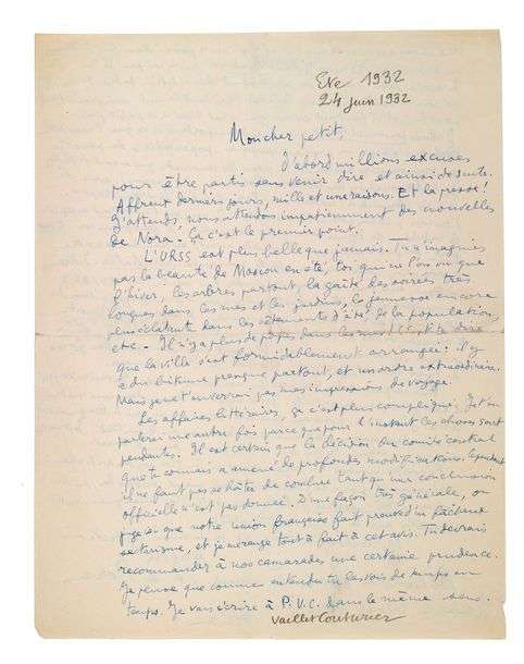 Lettre autographe signée adressée à Georges SADOUL S.l., 24 juin 1932, 2 pages in-4 à l'encre, enveloppe conservée à l'adresse de la «rue du Château».