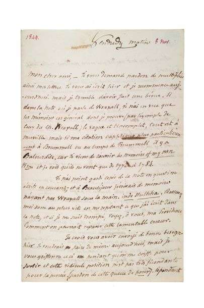 «[...] Je tremble d'avoir fait une bévue. Si dans la note où je parle de Wraxall [l'écrivain anglais Nathaniel William Wraxall], je n'ai en vue que les mémoires en général, [...] mais si ma citation s'applique plus particulièrement à Brummell ou au temps de Brummell, il y a balourdise, car je viens de r'ouvrir les Memoirs of my own time et je vois qu'ils ne vont que de 1772 à 1784 [...] Je n'ai point gardé la note en question [...] Rassurez-moi donc au plus vite en me répétant ce que j'ai écrit dans la note, et si je me suis trompé, voyez, ô vous, ma Providence, comment on pourrait réparer cette lamentable erreur.