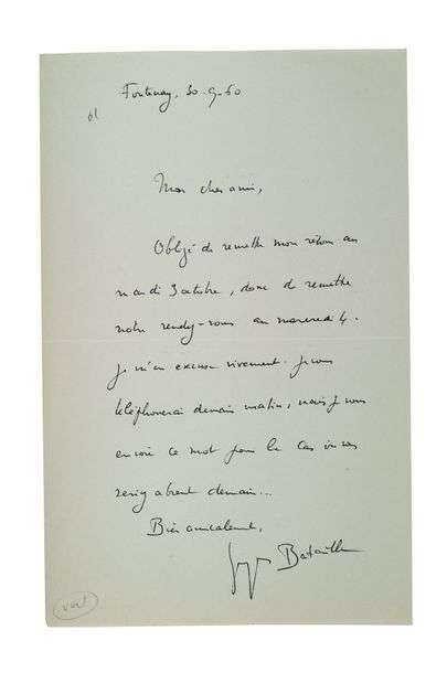 Lettre autographe signée à Lo Duca, auteur et éditeur d'ouvrages sur l'érotisme, dans laquelle Georges Bataille s'excuse d'être obligé de remettre un rendez-vous.
