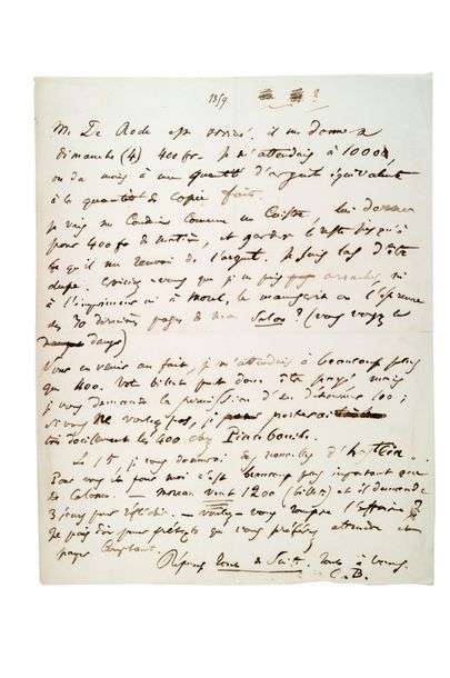 Lettre autographe signée «C. B.» adressée à Auguste POULET-MALASSIS [Paris, 1er ou 2 septembre 1859], 1 page in-4 à l'encre brune sur papier «M. de Rode [propriétaire et directeur de la Revue internationale] est arrivé. Il me donnera dimanche (4) 400 fr. Je m'attendais à 1000, ou du moins une quantité d'argent équivalente à la quantité de copie faite. Je vais me conduire comme un cuistre, lui donner pour 400 fr de matière, et garder le reste jusqu'à ce qu'il me renvoie de l'argent.