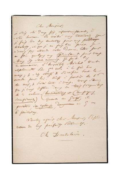 Lettre autographe signée adressée à Émile MARCELIN S.l.n.d., 1 page in-8 à l'encre avec adresse au verso du second feuillet Cette lettre autographe signée «Ch. Baudelaire » est adressée à Émile Marcelin, directeur du journal La Vie parisienne. Baudelaire a composé quelques petits «bibelots» (des poèmes sans doute) pour ce dernier, mais il les trouve mauvais et souhaite les recommencer.