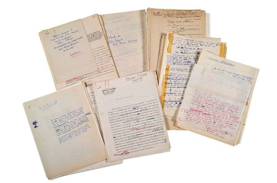 Important dossier de travail, réunion de notes, manuscrit dactylographié corrigé et projets d'illustrations pour ce divertissement qui tient du pamphlet et de la fantaisie philosophique, sur la simplification de l'orthographe. Texte publié en 1986 chez Grasset, avec des illustrations par J.-B. Fourt.