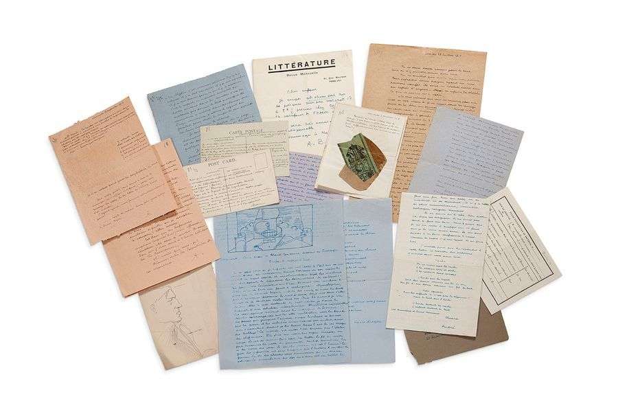 Documents divers comme le bulletin de remise des prix décernés à André Breton en 1901, 126 lettres ou cartes autographes signées d'André Breton ainsi que 6 autres non signées, 7 poèmes autographes signés, 6 dessins originaux, 4 collages, copies manuscrites de poèmes d'Aragon de Valéry et de Cendrars.