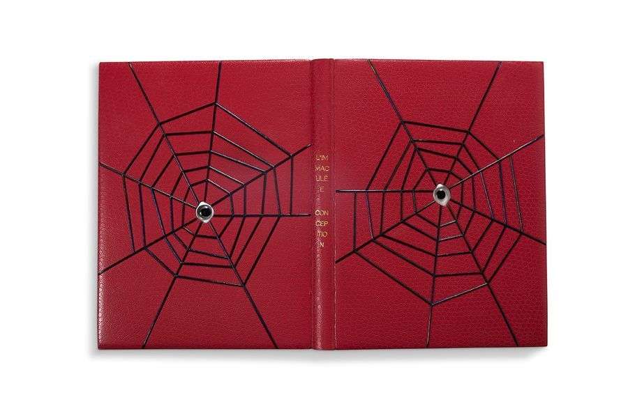 Éditions Surréalistes, José Corti, 1930. Frontispice gravé de Salvador Dali. In-4. Veau rouge vif pointillé. Au centre de chaque plat, incrustation d'un oeil de verre blanc et noir, autour duquel se déploie un réseau de fines moulures noires en relief, vernies et irisées, en forme de toile d'araignée. Dos lisse avec le titre doré, doublures et gardes bord à bord de veau crème. Tranches dorées sur témoins. Chemise de demi-veau crème à rabats, titre doré| étui bordé (Georges Leroux, 1969)
