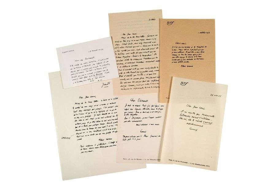 Correspondance de six lettres autographes signées adressées à Jean-Louis BARRAULT 1952-1959, 6 pages la plupart in-8 sur papier à entête de la NRF ou in-4.