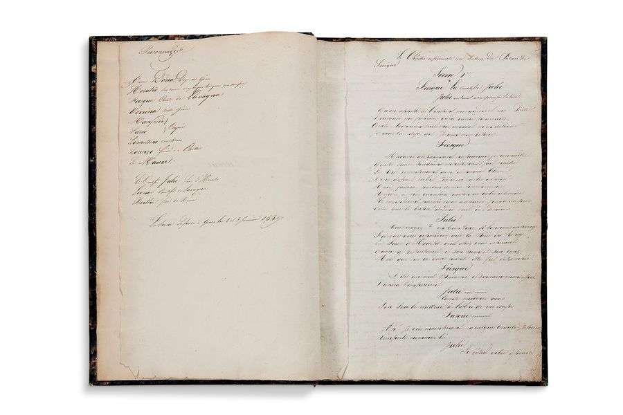 Important manuscrit d'une des premières pièces de Dumas. Ce drame, adapté du Fiesque de Schiller en 1827, fut refusé par la Comédie-Française le 14 mai 1828 (sous le titre Une conspiration à Gênes) et considéré comme perdu (dans Comment je devins auteur dramatique, Dumas laisse entendre qu'il a brûlé le manuscrit).