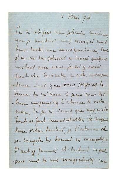S.l., 1er mai 1874, 2 pages in-8 sur papier bleu à l'encre