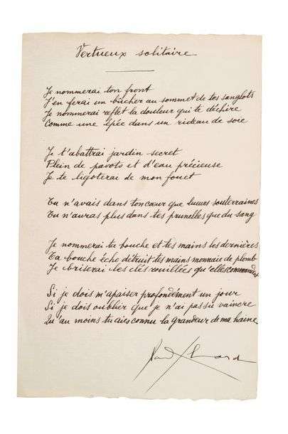 Vertueux solitaire, poème autographe signé