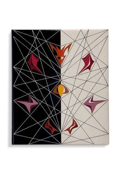 Le Livre Ouvert III, manuscrit autographe avec gouaches originales [Vers 1944], 91 pages in-4 montées sur onglets, box noir et box blanc séparés dans l'axe du plat. De chaque côté de cet axe se déploie en symétrie un jeu géométrique de filets blancs sur le noir et noirs sur le blanc| des motifs mosaïqués en veau s'inscrivent dans certaines des cases, ainsi intégrées entre les filets, dans des nuances jaunes, roses et cyclamen sur le premier plat, jaunes, vertes et bleues sur le second plat. Dos lisse, titre doré, doublures et gardes de daim jaune bordé de box noir et blanc, chemiseétui (Paul Bonet). (Carnets, 1 052). (Chemise-étui usagés).