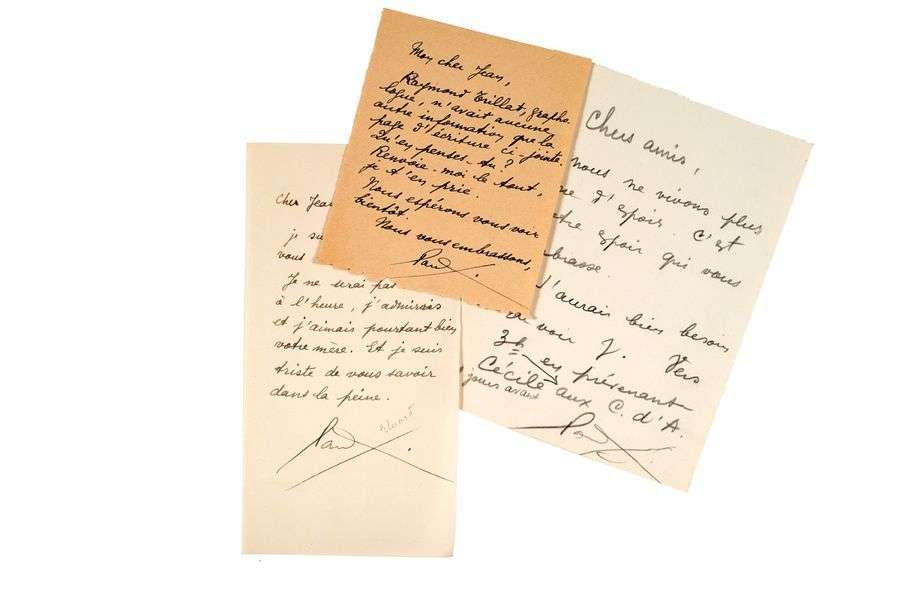 Trois lettres autographes signées adressées à Jean PAULHAN 1/[s.d.] 1 page in-12 à la mine de plomb. «Cher amis, nous ne vivons plus que d'espoir. C'est notre espoir qui vous embrasse. J'aurais bien besoin de voir J.[ean Paulhan] Vers 3 h en prévenant Cécile aux C.[ahiers] d' A.[art] 2 jours avant».
