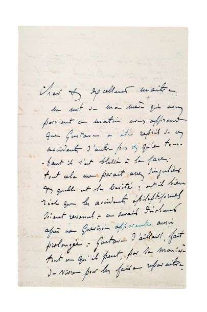 Lettre autographe signée adressée par Achille Flaubert, frère de Gustave, à l'anatomiste et chirurgien français Jules Cloquet: «Cher et excellent maître, Un mot de ma mère qui nous parvient ce matin nous apprend que Gustave a été repris de ces accidents d'autrefois et qu'en tombant il s'est blessé à la face. Tout cela me paraît assez singulier et quelle est la vérité? Est-il bien réel que les accidents épileptiformes soient revenus? Ce serait désolant après une guérison apparente aussi prolongée. Gustave d'ailleurs, fait tout ce qu'il peut, par sa manière de vivre, pour les faire reparaître. Il fait de la nuit le jour, des excès de travail, une surexcitation continuelle et que soit enfin la nature de l'accident qu'il a éprouvé, dites-la moi et quand il sera guéri ou remis sermonnez-le d'importance à ce sujet| il vous aime beaucoup et a comme nous tous grande confiance en vous, peut-être vous écoutera-t-il avec profit pour lui. Soyez assez bon pour me répondre à ce sujet et me dire aussi ce que vous pensez de ma mère. Mille pardons, mon cher maître, de vus importuner ainsi, mais vous êtes si bon pour nous que je n'ai pas hésité à m'adresser à vous pour avoir des renseignements que vous seul pouvez me donner [...]».