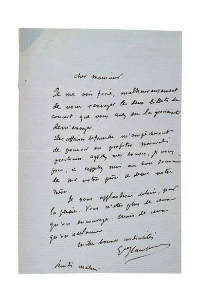 S.l.n.d., «Lundi matin», 1 page in-8 à l'encre «Cher Monsieur, je me vois forcé, malheureusement de vous renvoyer les deux billets de concert que vous avez eu la gracieuseté de m'envoyer. Les affaires de famille m'empêcheront de pouvoir en profiter mercredi prochain. Agréez mes excuses, je vous prie, et rappelez moi au bon souvenir de Mr votre père et Mme votre mère.