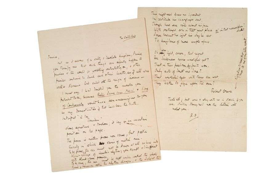 Lettre importante de Robert Graves adressée à Thomas Edward Lawrence [dit Laurence d'Arabie, célèbre officier et écrivain britannique connu pour son action auprès des tribus arabes], en réponse à l'une de ses lettres: «Lord, What I told you last week about my likes was not altogether true. There was an exception who provided a disproportionate share of the motive for the Arabian adventure, and who after it was over dictated the enclosed as preface to the story of it. I turned it out a day ago [...]: and I don't know [...] It's hardly a literary question of good or bad [...] but is it prose or verse?»