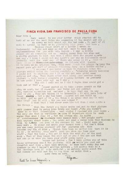 Lettre tapuscrite signée «Papa» adressée à Peter VIERTEL Cuba, 1er mai 1958, en anglais, 1 page in-4 sur papier à en-tête «Finca Vigia San Francisco de Paula Cuba»