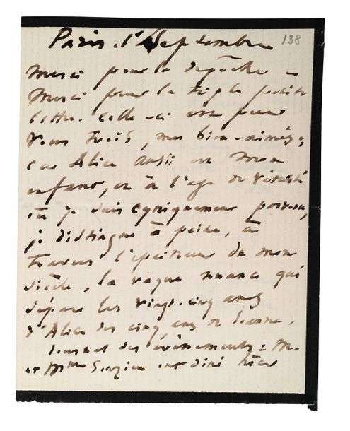Merci pour la triple petite lettre. Celle-ci est pour vous trois, mes bien-aimés. Car Alice aussi est mon enfant, et à l'âge de vétusté où je suis cyniquement parvenu, je distingue à peine, à travers l'épaisseur de mon siècle, la vague nuance qui sépare les vingt-cinq ans d'Alice des cinq ans de Jeanne [...] Il fait beau, je suis triste, j'attends votre retour, je travaille».