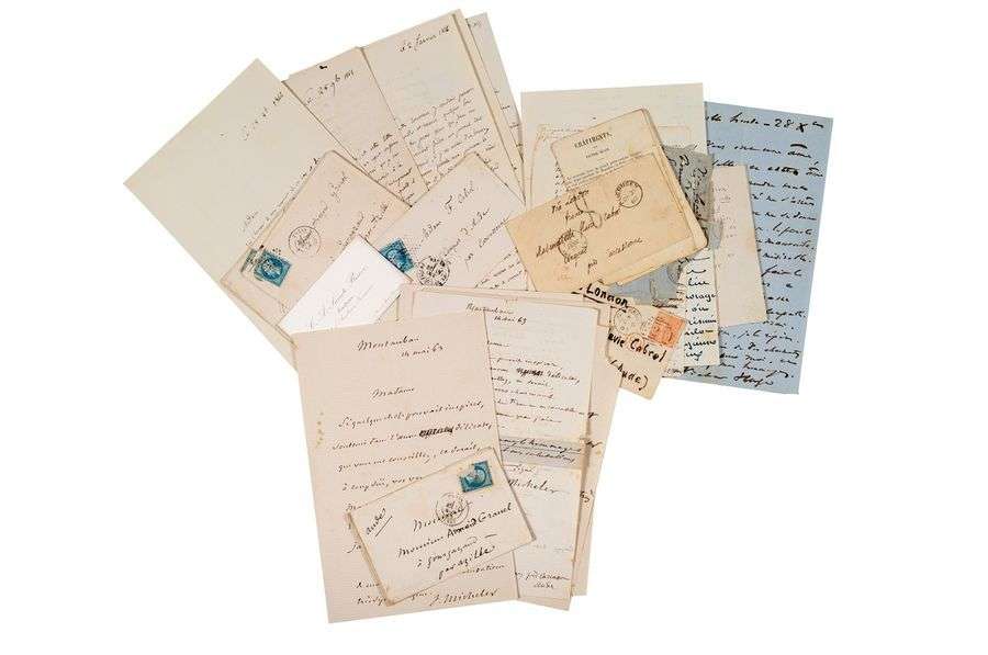 - 5 lettres autographes signées de Jules Michelet datées de 1863 à 1866 in-4 avec 2 enveloppes et la carte de visite de l'historien.