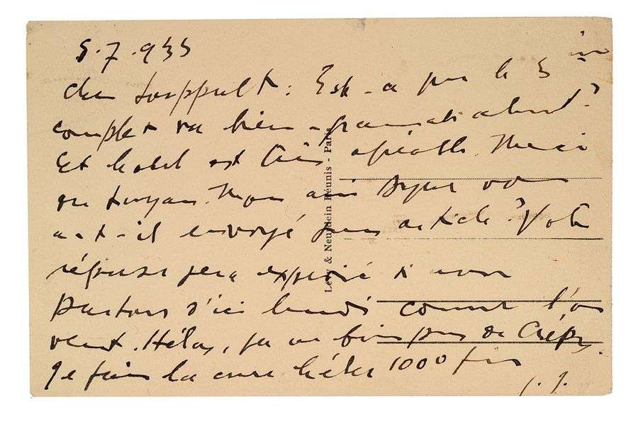 Carte autographe signée à Philippe SOUPAULT [Évian], 5 juillet1933, en français, 1 page oblong in-8 au dos d'une carte postale illustrée du Grand Hôtel d'Évian, monogrammée «J.J.».