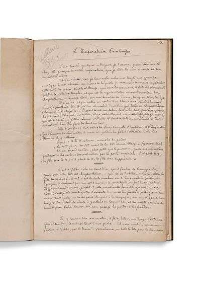 Kyoto, la ville sainte (Départ de Kobé) (28 pages) a paru dans La Nouvelle Revue du 1er mars 1887. Loti indique qu'il s'agit d'un «brouillon», qui porte de nombreuses corrections à l'encre rouge. Visite de la ville sainte de Kyoto: «Jusqu'à ces dernières années, elle était inaccessible aux Européens, fermée, mystérieuse - à présent voici qu'on peut y aller en chemin de fer| c'est le