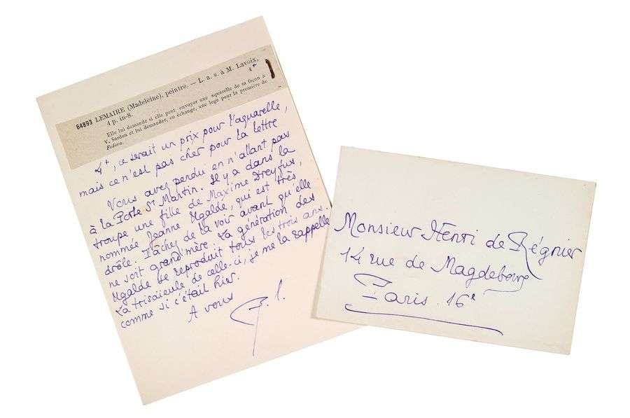 A propos d'une lettre de Madeleine Lemaire, dont il épingle la description découpée dans un catalogue de libraire: «4 f., ce serait un prix pour l'aquarelle, mais ce n'est pas cher pour la lettre». Il l'engage à aller à la Porte