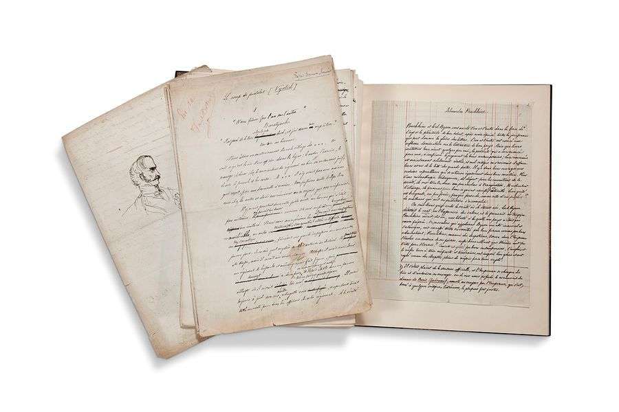 2/Manuscrit autographe de l'étude de Mérimée sur Pouchkine publié dans le Moniteur Universel des 20 et 27 janvier 1868 et reprise après la mort de Mérimée dans Portraits historiques et littéraires (1874), 22 pages grand in-4, corrections et ajouts autographes. Demi-maroquin vert relié par Pierre Lucien Martin.