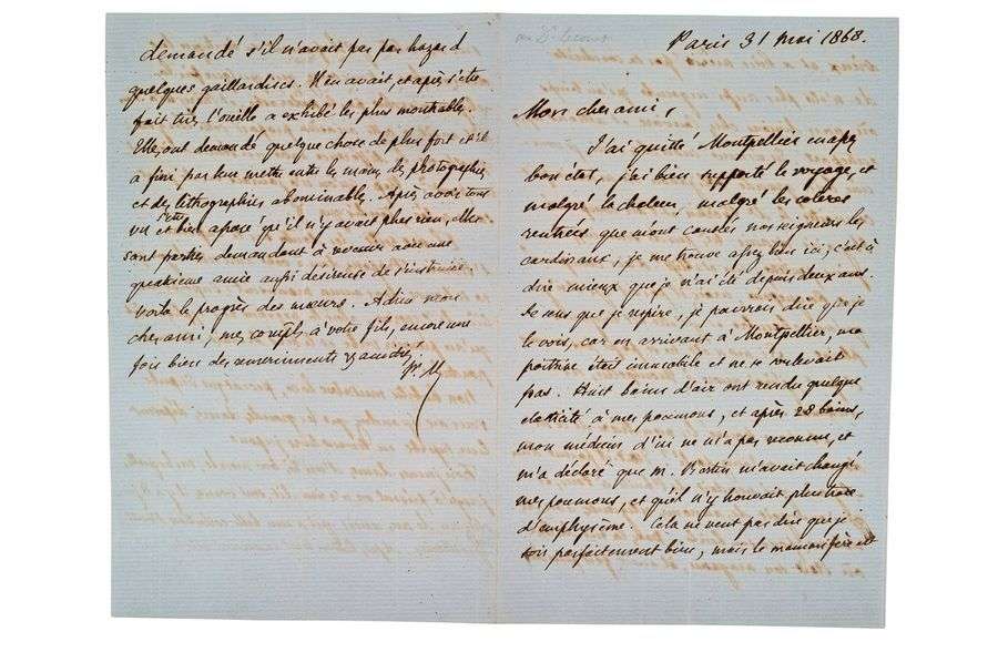 Lettre autographe signée au docteur LECOURT Paris, 31 mai 1868, 4 pages in-8, à l'encre noire sur un double feuillet de papier vergé bleu «Mon cher ami, J'ai quitté Montpellier en assez bon état, j'ai bien supporté le voyage, et malgré la chaleur, malgré les colères rentrées que m'ont causées nos seigneurs les cardinaux, je me trouve assez bien ici, c'est-à-dire mieux que je n'ai été depuis deux ans. Je sens que je respire, je pourrais dire que je le vois, car en arrivant à Montpellier, ma poitrine était immobile et ne se relevait pas. Huit bains d'air ont rendu quelque élasticité à mes poumons, et après 28 bains, mon médecin d'ici ne m'a pas reconnu, et m'a déclaré que M. Bertin m'avait changé mes poumons, et qu'il n'y trouvait plus trace d'emphysème. Cela ne veut pas dire que je sois parfaitement bien, mais le mammifère est vieux et a bien mérité par sa conduite de n'être plus aussi ingambe où nous dînions chez Couviere et allions après autre part. En résumé, mon cher ami, je vous ai une bien grande obligation de m'avoir fait connaître le Dr Bertin et l'air comprimé. [...] Si mon été ne se passe pas comme il faut, j'irai à Montpellier cet automne. A-t-on trouvé le meurtrier de ce Mr dont vous m'avez parlé?