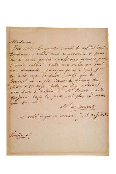 «Madame, Voici votre lorgnette, voilà le vol[um]e d'Aristophane, voilà mes remerciements pour me l'avoir prêté| voilà mes excuses pour l'avoir oublié| voilà une valse que je vous demande parce que je n'ai pas pu en avoir une vendredi| voici que le Journal de ce soir donne le discours de Chaix d'Estange [...] voilà que je vous baise les pieds ni plus ni moins que M. M...». Sous sa signature, Musset ajoute: «et voilà ce qui m'arrive. J.S.A.F.D.V. [Je suis amoureux fou de vous]».