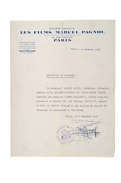Certificat de travail de Joseph Martinetti fait par Marcel Pagnol. Il certifie que Joseph